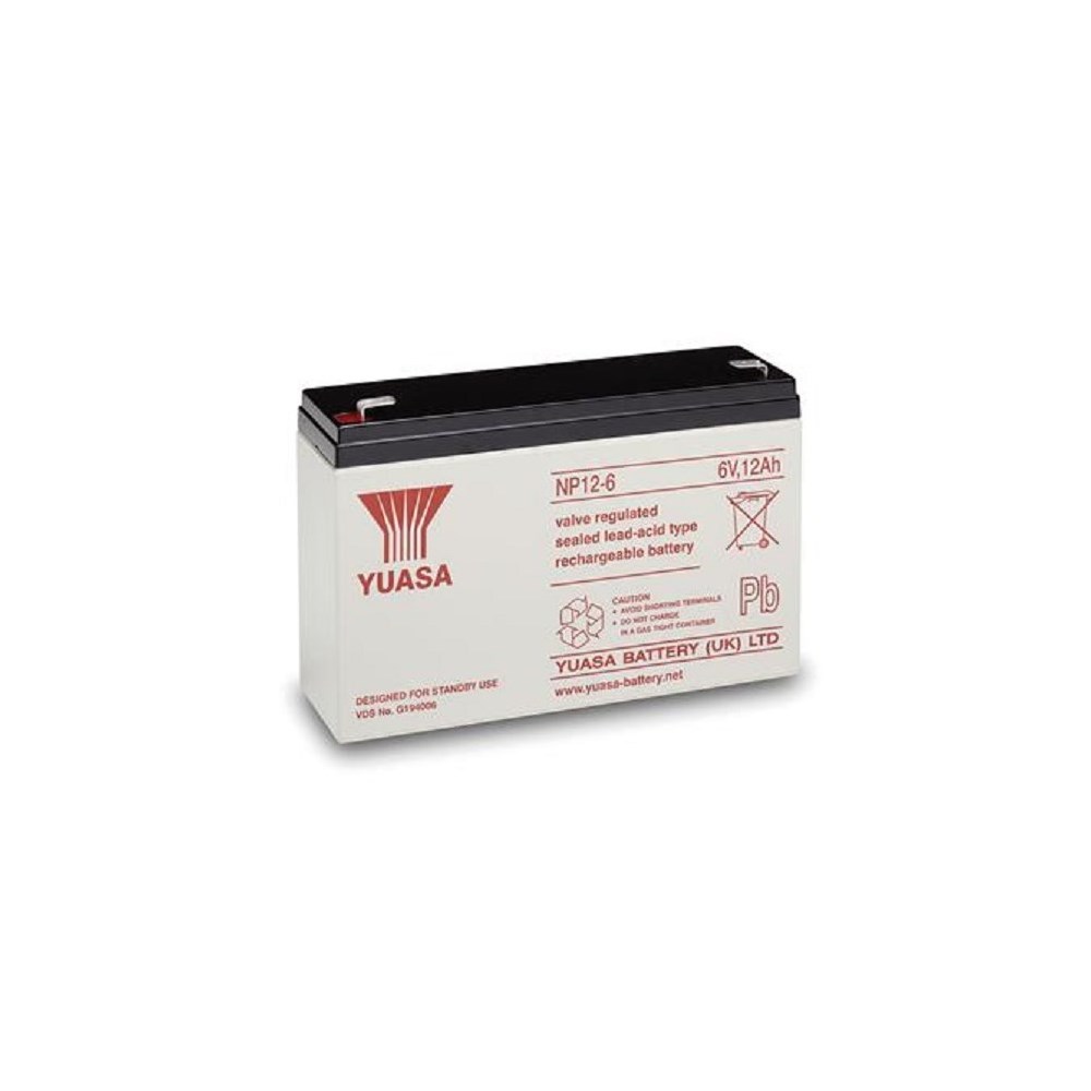 Volt: 6 Ah: 12 Lengde: 151 mm Bredde: 50 mm Høyde: 97,5 Vekt: 1,988 kg Terminal: 6,3mm flatstift Kjemi: Bly (Pb) Levetid: 3-5 Elnummer: 6202606 Info: Blybatteri 6 Volt 12 Ah Diverse: Flatstift 6,3mm, L-Nr: 6202606