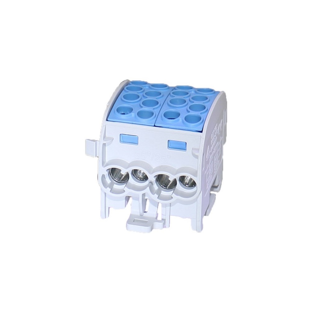 Distribusjonsklemmer som kan klipses sammen med flere av samme type. Fås i fargene Grå, blå og Grønn. Godkjent for tilkobling av aluminium og kobber. Inngående side: 4x25 - 2,5mm2, enkjernet/flertrådet (4x16 - 1,5mm2 med endehylse). Utgående side: 4x16 - 2,5mm2 enkjernet/flertrådet (4x10 - 1,5mm2 med endehylse). Tilkoblingsmoment er angitt på klemme.