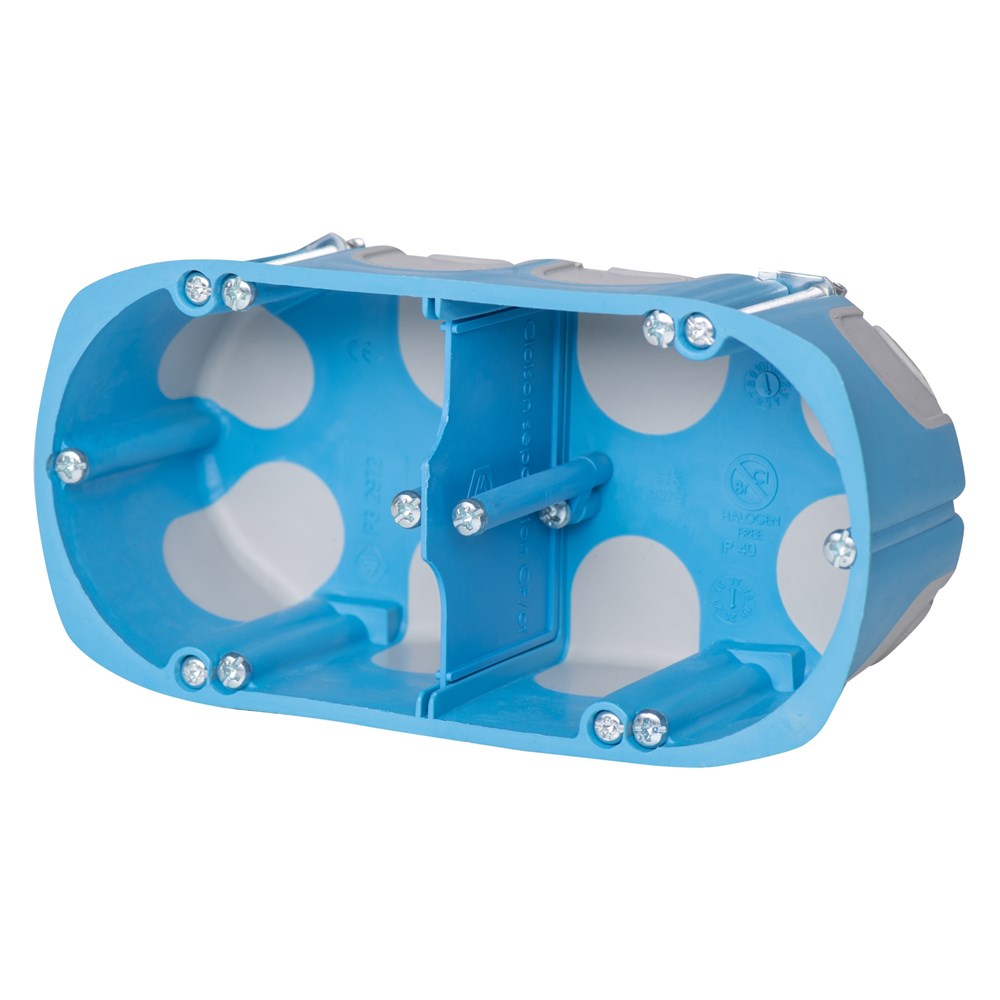 Veggboks dobbel med membrann innføring HW202K . Boksen kan enkelt ettermonteres i et 2x Ø 68 mm hull. Benyttes når utstyr må monteres uavhengig av stenderverk eller etter veggen er ferdigstilt. Flere bokser kan monteres med den avkuttede siden mot hverandre.