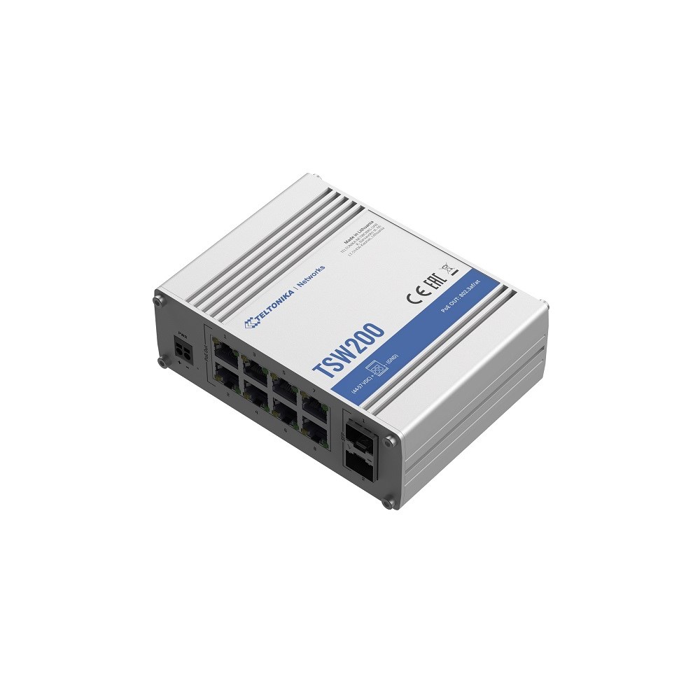 TSW er Teltonikas første serie med industrielle L2-switcher med PoE. TSW200 er en liten, unmanaged 8-ports GbE PoE 802.3at/af med totalt strømbudsjett på 240W. Den har også 2 SFP-porter for fiberlink. Ingen klargjøring eller konfigurasjon - bare plug and play.