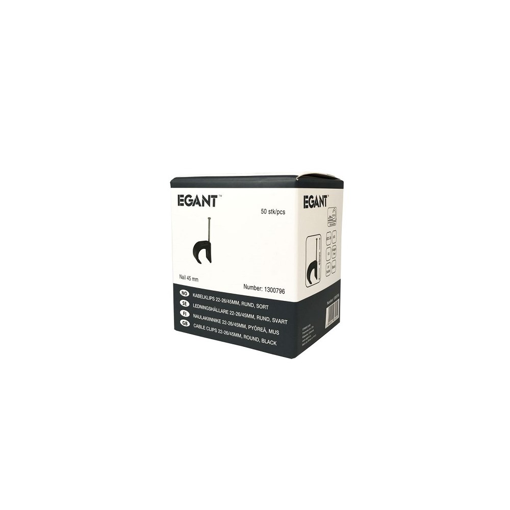 pris pr stk leveres i eske a 50 stk.spikerklammer 22-26mm rund ledning. Svart. Klips halogenfri korrosivitetsklasse C4. Klips av hvit UV-bestandig plast med forsterket 45mm stålstift.