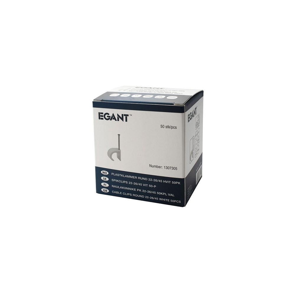 pris pr stk leveres i eske a 50 stk. spikerklammer 22-26mm rund ledning. Hvit. Klips halogenfri korrosivitetsklasse C4. Klips av hvit UV-bestandig plast med forsterket 45mm stålstift.