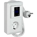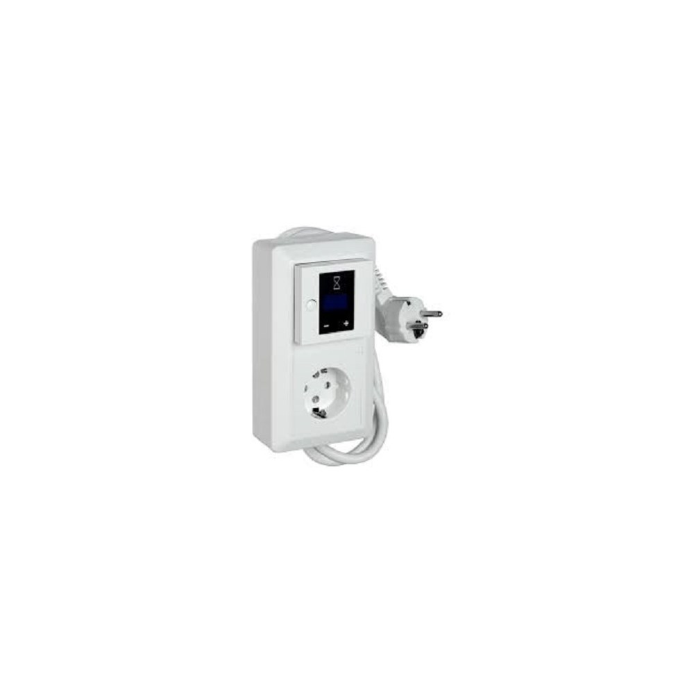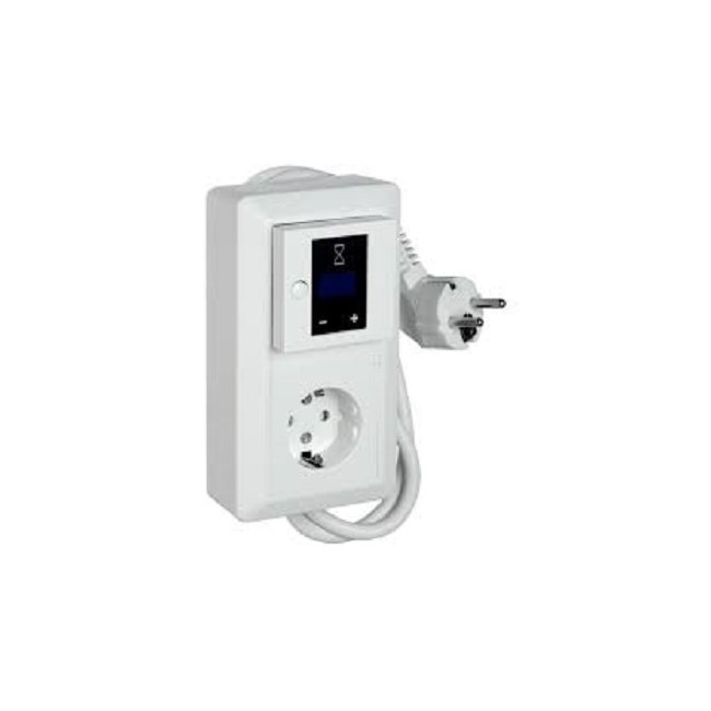 Tidsbrytersett bestående av displaytimer og enkel stikkontakt. Tidsbrytersettet er ferdig terminert med tilkoblingskabel med støpsel. Benyttes til kaffetrakter, vifter, strykejern, lys etc. Tidsbryteren har en på/av funksjon med tidsintervall fra 1 minutt til 8 timer. Tidsbyteren kan fjernbetjenes med en impulsbryter, for både å skru av eller på etterløpstiden. Etterløpstiden justeres ved å trykke på henholdsvis - eller +, hvis ingen justering finner sted i løpet av 3 sekunder, vil tidsbryteren koble inn lasten og tiden begynne å løpe. Maks belastning: 16A Driftspenning: 230V / 50Hz. Max belastning: - Omsk last: 3600W / 16A. - Elektronisk trafo: 1000VA - Motorer: 500VA - 230V Halogen: 1000W - LED Lamper: 100W Elektronisk overspenningsvern og overopphetingsvern. Betjening: Touch display Bryterfunksjon: 1 Polet relé, 2 polet ved betjening av bryteren. Tidsinnstilling: 1, 2, 3,.....20min, 30,40,50 min. 1, 1.5, 2, ....8 timer. Justere tidsinnstilling: med +/- i front på displayet. Kapslingsgrad: IP20 Driftstemperatur: -10 - +35 grader. Max. tilkoblingstversnitt: 2,5mm2