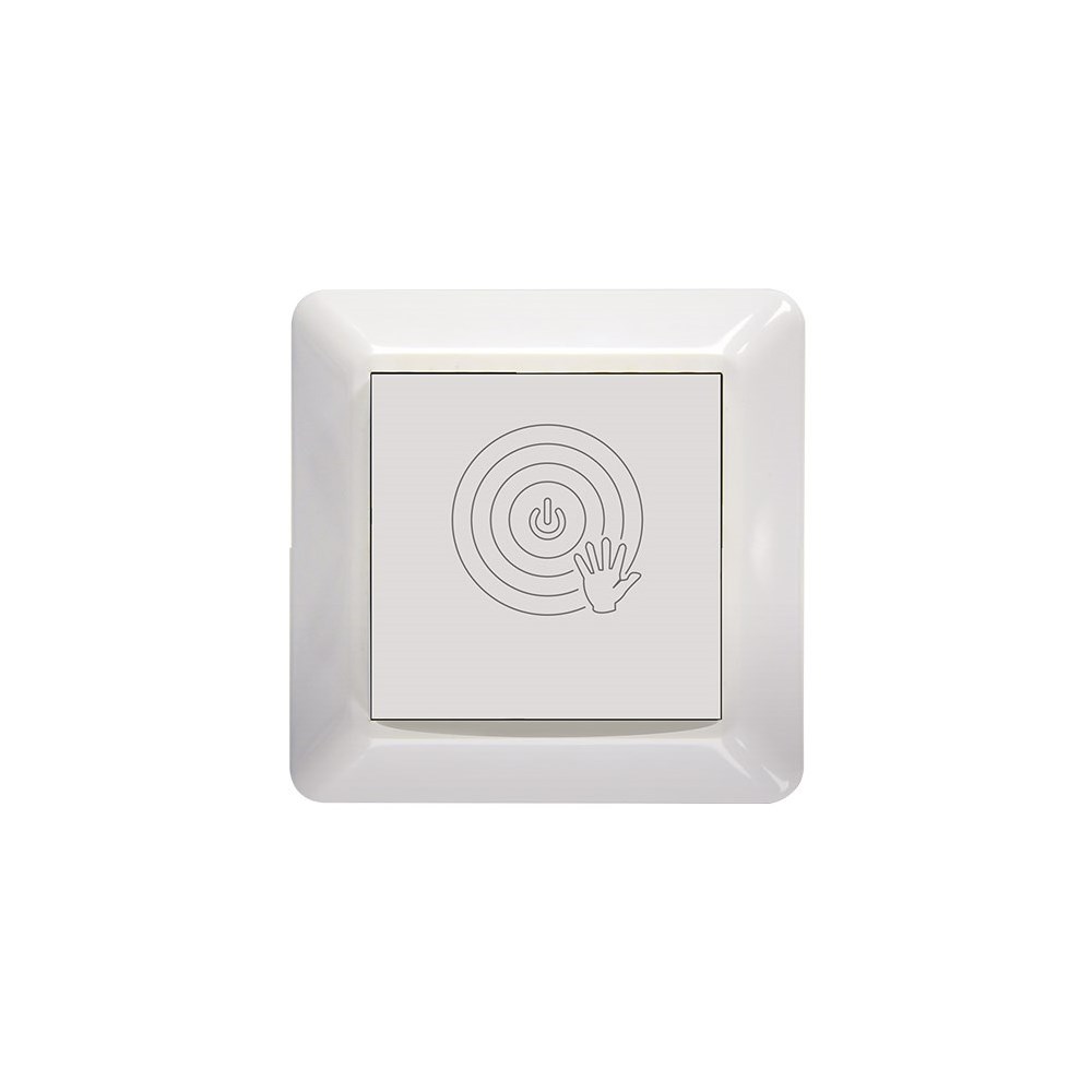 Hygienisk berøringsfri bryter egnet til f.eks. lysstyring. Med en enkel håndbevegelse slås reléutgang på, og ved neste bevegelse av. Enkelt design med figurer som viser produktets funksjon.