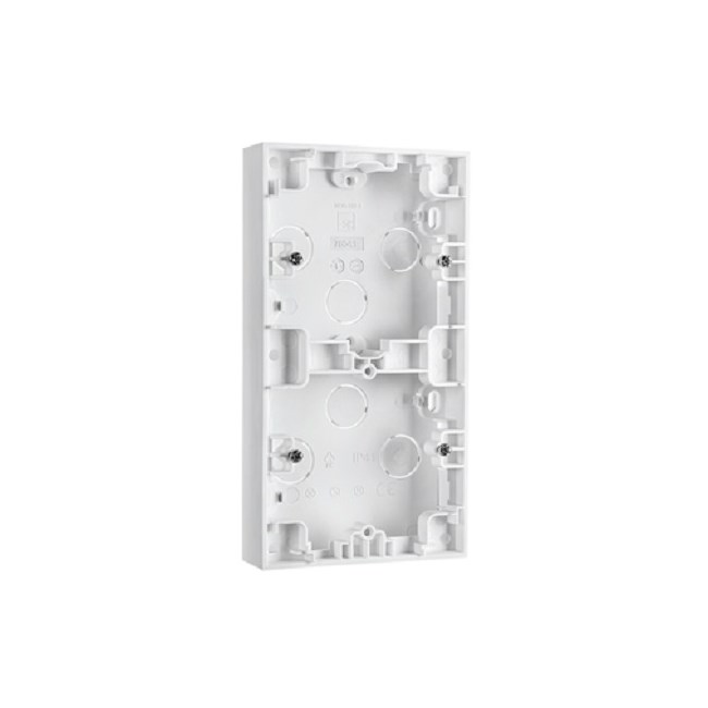 Dobbel påveggskappe 23mm i hvit utførelse som passer til innfelt materiell ved ønske om utenpåliggende montering. Benytt festeklips fra singel bryter ved innfesting av brytere. Utsparing utføres med utsparingstang for en riktig tilpasning til kabel.