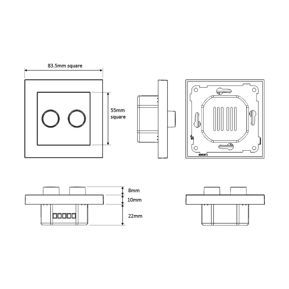 LEDDim 2x100 fasesnittdimmer sikrer stabil dimming av lyset uten tilkoblet N. Dimmeren kan styre 2 laster og lysnivåene justeres etter lyskildene ved å stille inn minimums- og maksimumsnivået manuelt.