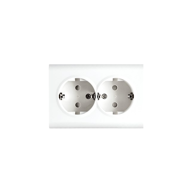 Påvegg dobbel stikk i hvit utførelse, med jord og integrert barnevern. SG-klemmer sikrer rask installsjon!
