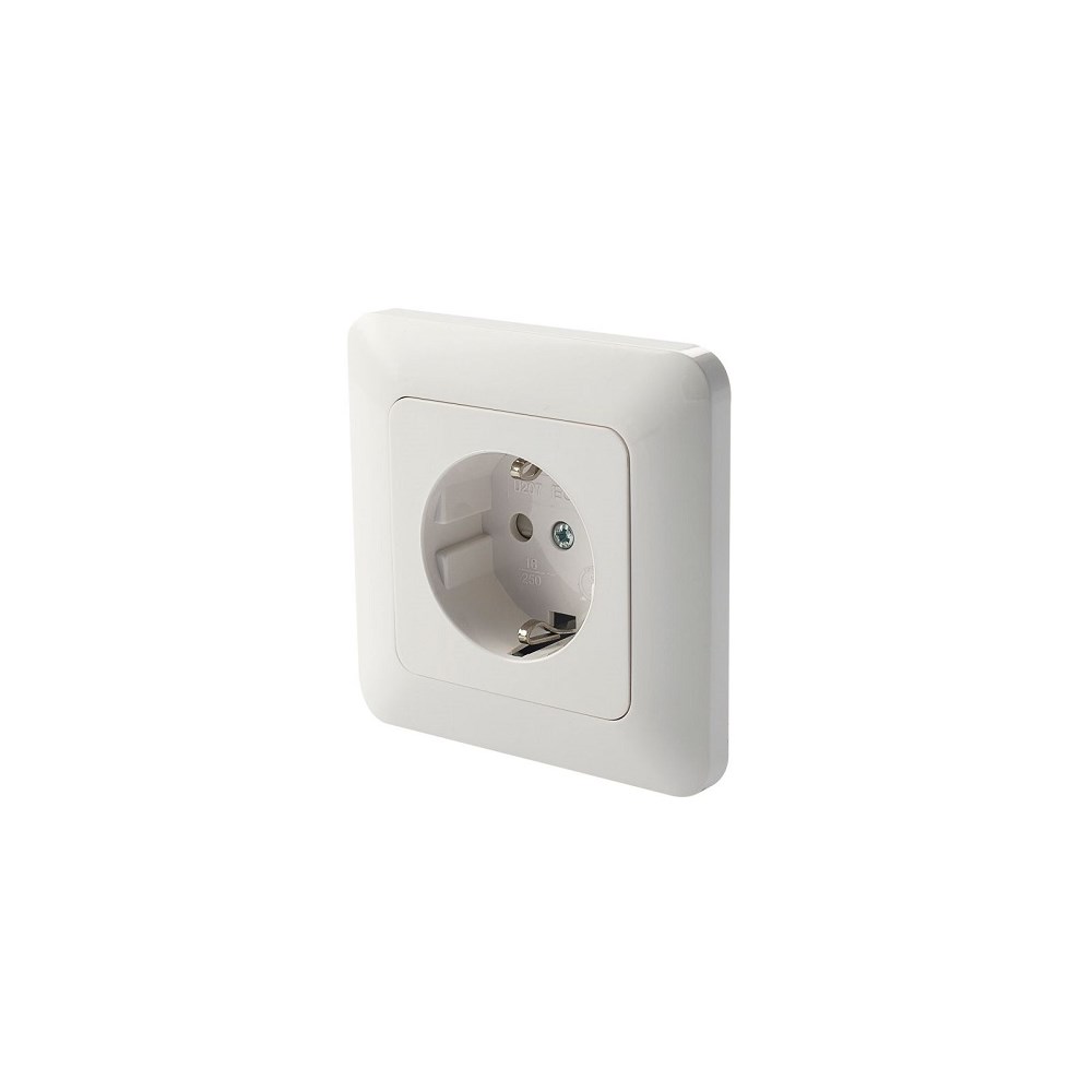enkel innfelt stikkontakt med jord og barnevern. Pozidriv skruer i tillkoblingsterminaler. Passer i standard veggbokser (CC-60mm). Alpinehvit RAL9003 . 16A 250V. IP20.