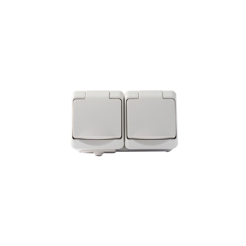 dobbel påvegg stikkontakt med lokk og barnevern. Pozidriv skruer i tilkoblingsterminaler. Sort. 16A 250V. IP44 for utendørs installasjon. Utskiftbare nipler for kabel.