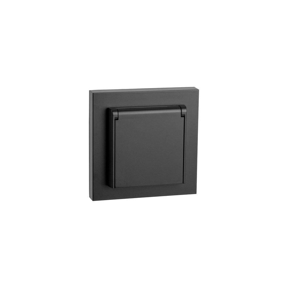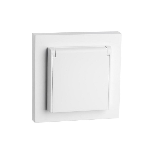 IP44 Innfelt enkel stikkontakt med lokk, benyttes i våtrom eller der det er behov for en enkel innfelt stikkontakt med krav til IP grad. Stikkontakten leveres med en gummipakning, som sørger for en tett overgang mot vegg, dersom denne ikke benyttes blir stikkontakten IP20 med støvlokk. Stikkontakten bør monteres med hengslene i overkant, slik at lokket lukkes naturlig. Leveres i halogenfritt polykarbonat som gir økt fargebestandig hvitfarge. Den sorte stikkontakten har gjennomfarget sort materiale og gjør den robust mot skraper og merker.