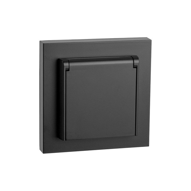 IP44 Innfelt enkel stikkontakt med lokk, benyttes i våtrom eller der det er behov for en enkel innfelt stikkontakt med krav til IP grad. Stikkontakten leveres med en gummipakning, som sørger for en tett overgang mot vegg, dersom denne ikke benyttes blir stikkontakten IP20 med støvlokk. Stikkontakten bør monteres med hengslene i overkant, slik at lokket lukkes naturlig. Leveres i halogenfritt polykarbonat som gir økt fargebestandig hvitfarge. Den sorte stikkontakten har gjennomfarget sort materiale og gjør den robust mot skraper og merker.