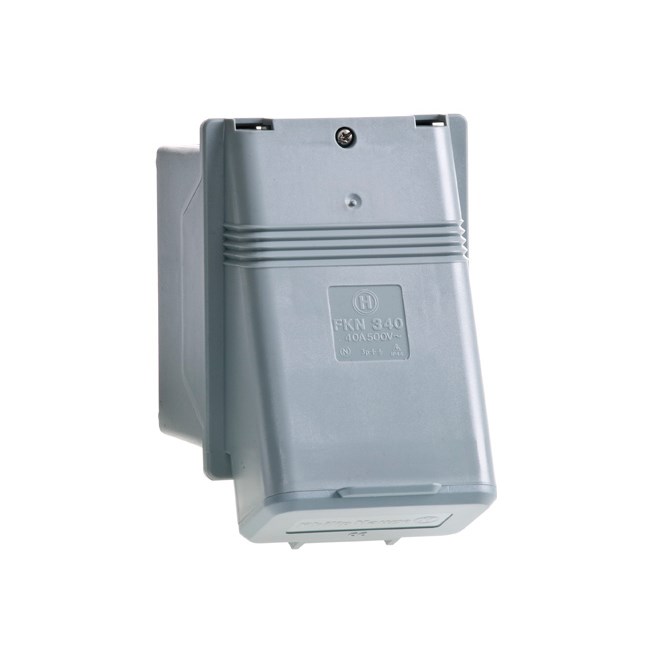 HAUGE stikkontakt for vegg flatstift 40A, 3P+J, IP44. Normer: EN 60309-1, NEK EN 60309-1; Appendix A. Kapslingsmateriale: Termoplastisk polyester. Innsatsmateriale: Polyamid. Tilrettelagt for gjennomkobling. Tilkobling skjer ved heiseklemmer. Berøringssikker innsats (IP20). Bunnboksen har utslagbare svekninger, M20 og 2xM25/M32 eller 2xM20 og M25/M32. Nippelstørrelsen på topp/bunn kan velges ved å vri underdelen180 grader.