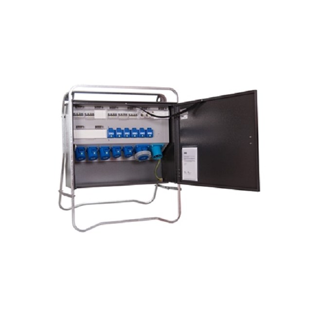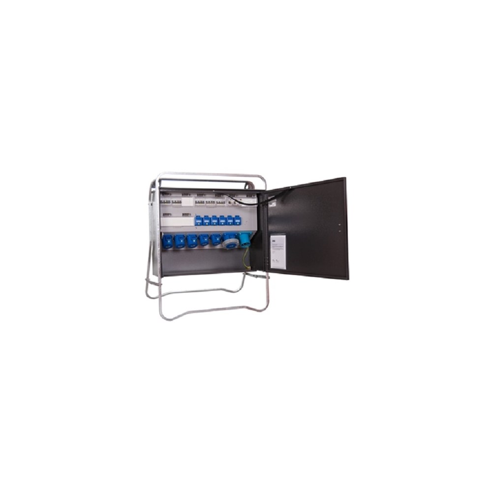 Inntak: 1 Stk. Apparatinntak 3 + Jord 63 Amp. Blå Uttak: Avsikret med: 1 Stk. Stikk UI 363-9 Direkte videremating. 3 Stk. Stikk UI 332-9 3 Kombiautomat 3pol 32C 30mA. 2 Stk. Stikk UI 316-9 2 Kombiautomat 3pol 16C 30mA. 6 Stk. Stikk enkel schuko 3 Kombiautomat 2pol 16C 30mA.