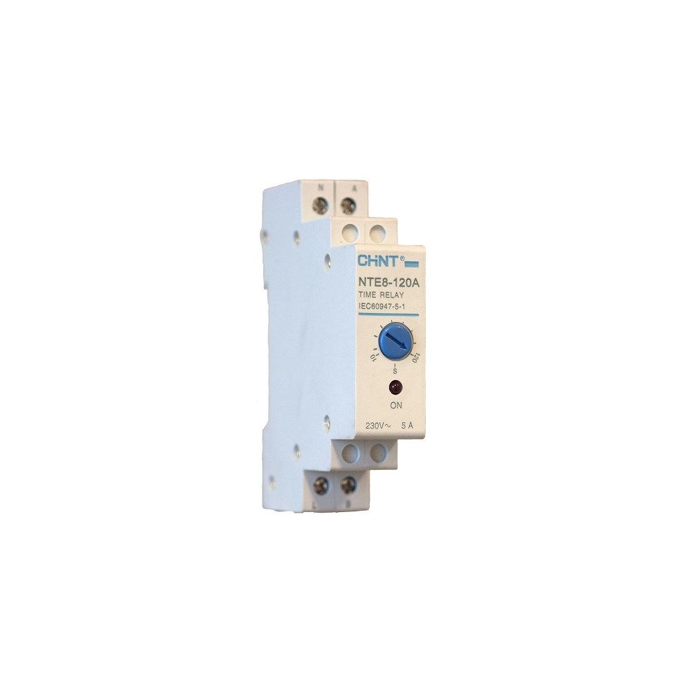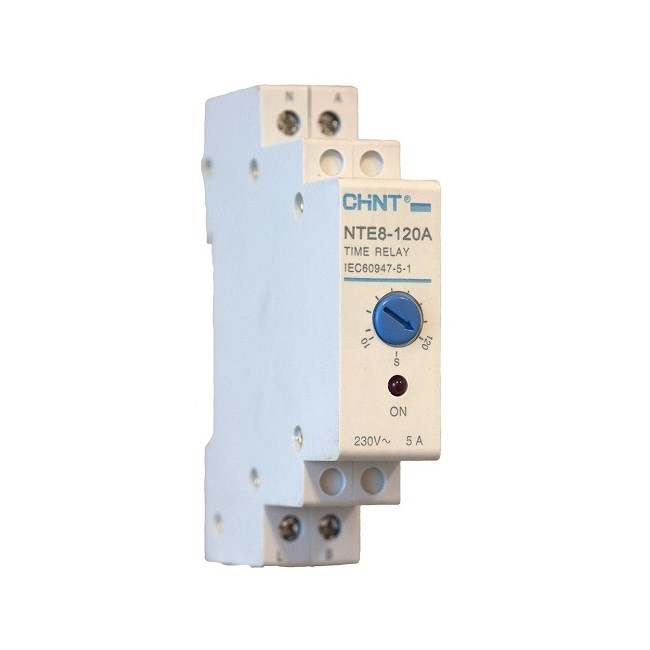 Tidsrele som kan justeres mellom 10-120 sekunder. Forsinket utkobling. Kan ikke driftes på 24V DC. Fungerer ved pulssignal (fra L-fase) inn på terminal A og veksler da fra NO til NC mellom terminal L og B i det tidsrommet som er stilt inn.