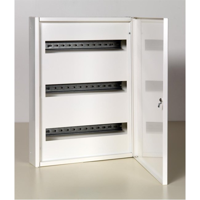 Flexibox for påvegg Montering. Nemko godkjent i.h.t Tavlenormen EN61439-1,3 for 3x63A IT/230V/50Hz og 4x63A TN/400V/50Hz. Skapet har 3 sikringsskinne fhver med 18 moduler. Frontrammen med dør har regulerbar innfesting for veggplatetykkelse fra 12 til 26 m m. Dørlås har meiselspor og vrider, men kan enkelt byttes til nøkkellås.