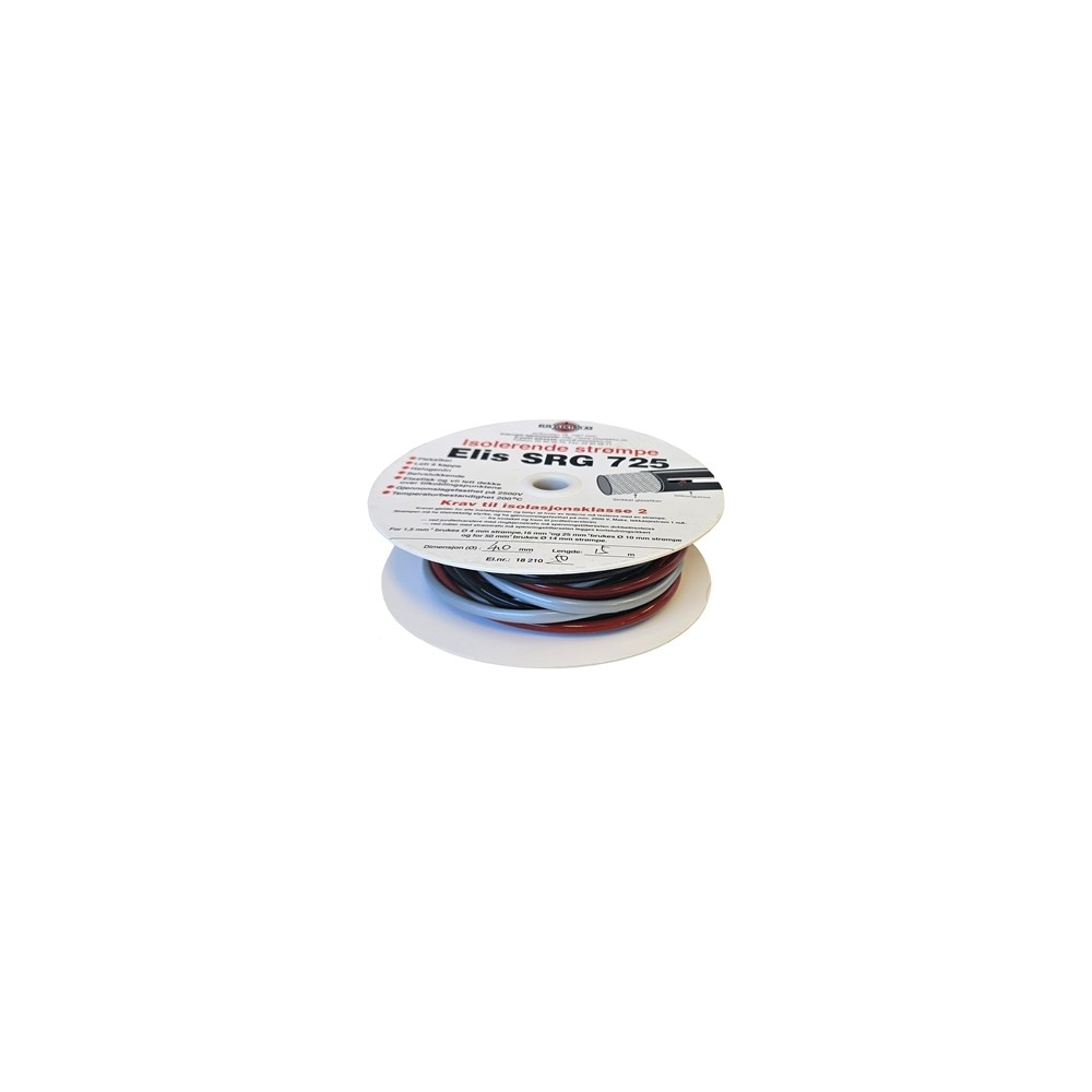 Strømpen er laget av spesialbehandlet glassfibertråd, utvendig belagt med silikongummi. Strømpe for dobbeltisolering og kortslutningssikker forlegning klasse H/C (200°C) Leveres også i sett bestående av 3x5 m strømpelengde i fargene brun, hvit og sort (el. nr 18 210 50) og 4x5 m strømpelengde i fargene brun, blå, hvit og sort (el. nr 18 210 59), for merking av de enkelte fasene. Indre diameter: 4 mm Temperaturbestandighet: +200 °C varig (klasse H/C) +260 °C kort tid Elektrisk gjennomslagsfasthet: > 2,5 kV Selvslukkende: Ja Halogenfri: Ja Godkjenning: UL 1441 UV-bestandig: Ja Oppbygning: 1. Glassfiber 2. Silikongummi Kravet sier: strømpen må ha tilstrekkelig mekanisk styrke, ha en gjennomslagsfasthet på minimum 2000 V. Maksimal lekkasje-strøm må ikke overstige 1 mA. - ELIS SRG 725 møter alle disse krav. Kravet gjelder fra inntaket og frem til jordfeilvarsler Dobbelisolering: For 16 og 25 mm² kabel brukes en 10 mm strømpe og for 50 mm² kabel brukes en 14 mm strømpe. Korslutningsikker forlegning av målersløyfe: Godkjent for kortslutningsikker forlegning av målersløyfer, for PN 1.5 mm².