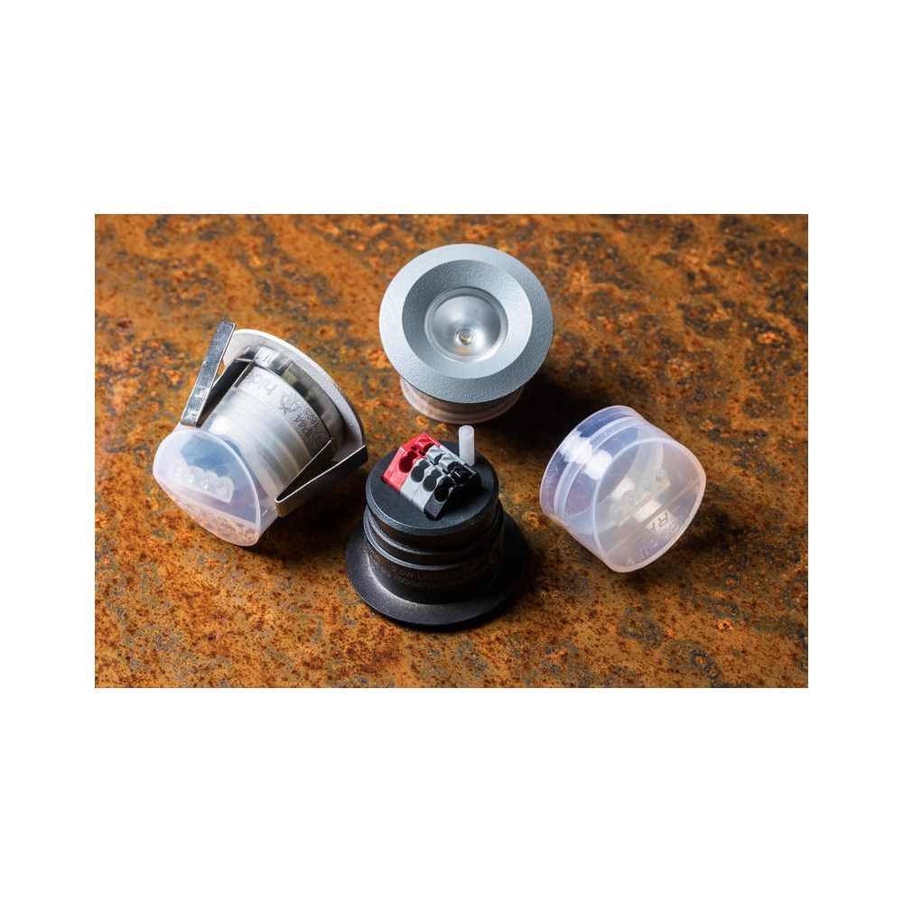 Liten LED-spot for montering både innendørs og utendørs. Smart integrert hurtigkobling som forenkler seriekoblingen, fjerner plunderet med eksterne skjøtestykker og minimerer feilkilder. Passer utmerket til innfelt eller utenpåliggende montering i f.eks. tak på badet. Som standard IP44 fra undersiden, og med den medfølgende silikon-tetningen er den også IP44 rundt. Driver bestilles separat og kan leveres med og uten dimmemulighet.