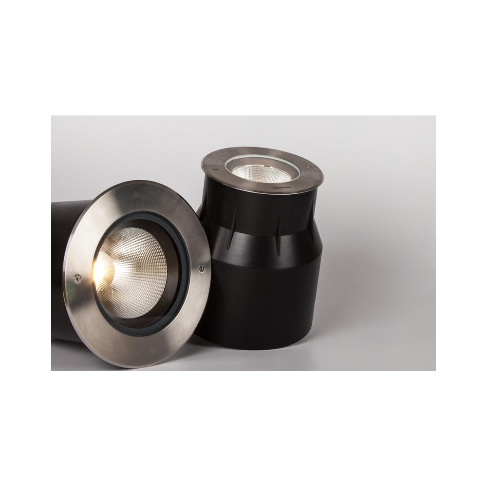 Energieffektiv bakkelyskaster for offentlig miljø. Perfekt for eksempel for parker, arenaer og industrieiendommer. Nedsenket LED-chip (COB) med moderne reflektorteknikk gir et strålende og god avblendet symmetrisk lys. Armaturhus i støpt aluminium, utvendig ring i rustfritt stål (316SS) og herdet beskyttelsesglass. Kan monteres i bakken eller støpes inn med den medfølgende monteringsboksen. Leveres komplett med innebygd driver, 2 m gummikabel og monteringsboks.