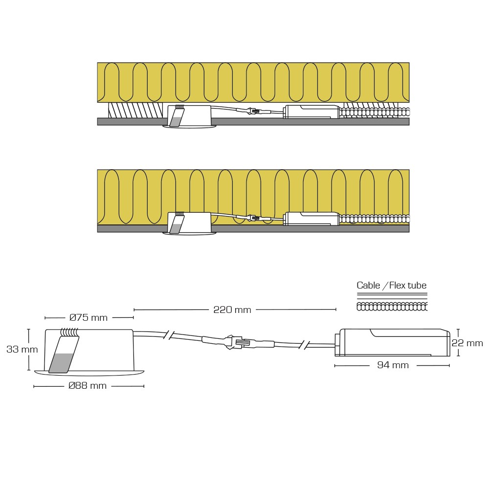 Luna LP ELITE 5,4W 360 lumen 2700 kelvin cri>90. kan monteres direkte i isolasjon . Utskjæring Ø 75mm. leveres uten pære Høytde 33mm Utvendig mål 88