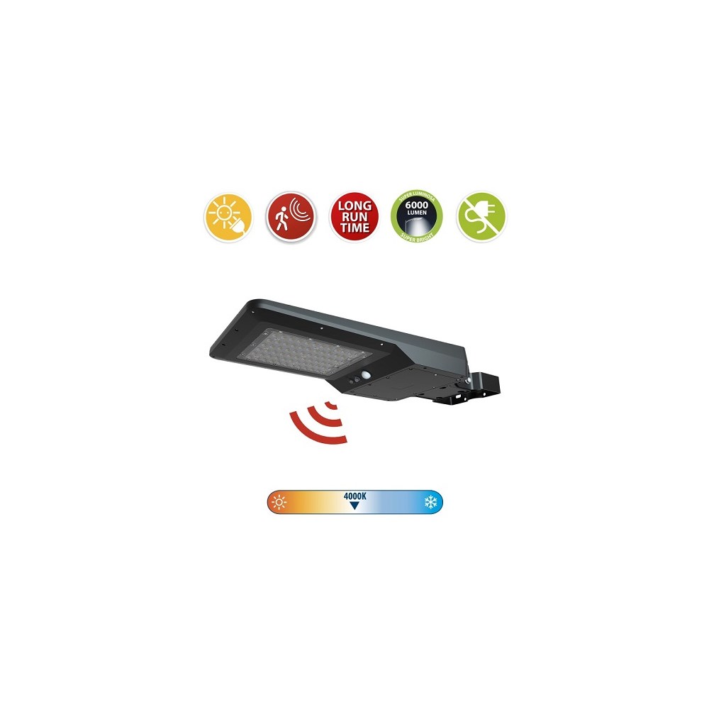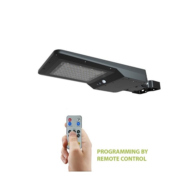 Ultralyssterk: Den solcelledrevne gatelykten på 40 W er utstyrt med 90 SMD LED-lys som gir supersterk belysning for et utendørsområde på omtrent 80 kvm. Denne kraftige utendørs solcellelampen kan installeres på en mast eller festes til veggen, og garanterer deg 6000 lumen. Et 12000 mAh litiumbatteri med stor kapasitet sikrer lang batterilevetid, selv i dager uten solskinn. Intelligent ladeteknologi: Det integrerte solcellepanelet konverterer sollys til elektrisitet med høy effektivitet (21 W monokrystallinsk). Den nyeste generasjonen ladesystem gjør solcellepanelet oppladbart selv på overskyete eller regnfulle dager. Belysning garantert 365 dager i året. Med bevegelsessensor: Gulvlampen lades om dagen og slås på automatisk om natten. Driftsmoduser: 1) Konstant lysmodus: Lampen slås automatisk på om natten og opprettholder konstant 60 % lysstyrke i 4 timer, deretter bytter den til bevegelsessensormodus. 2) Bevegelsessensormodus: Lyset slås automatisk på til 100 % lysstyrke når bevegelse oppdages innenfor et område på ≤ 12 meter, og dimmes deretter til 30 % lysstyrke etter 20 sekunder uten bevegelse. Allsidig utendørslampe: Lampen er designet for utendørs bruk. Den er derfor motstandsdyktig mot vann (sertifisert IP65), UV og atmosfæriske stoffer (hyperbestandig polykarbonat). Gulvlampen fungerer mellom -15 og +50 grader. Motstår ekstreme værforhold, som lyn, regn, snø. Perfekt for hage, terrasse, gårdsplass, garasje, rasteplass, parkeringsplass, næringsbygg osv. Enkel å installere: Denne utendørs solcellelampen er enkel å installere. Du trenger ikke å trekke en elektrisk ledning, lage grøfter osv. ... den er helt trådløs. Og den sparer også mye: 0 euro på regningen! Den kan monteres på en vegg eller på en stang (rett eller buet). Anbefalt installasjonshøyde er omtrent 3 til 5 meter. Utstyrt med en praktisk fjernkontroll for å kontrollere og programmere den. Anbefalt installasjonsavstand er rundt 3 til 5 meter. Utstyrt med en praktisk fjernkontroll for å kontrollere og programmere den. Anbefalt installasjonsavstand er rundt 3 til 5 meter. Utstyrt med en praktisk fjernkontroll for å kontrollere og programmere den.