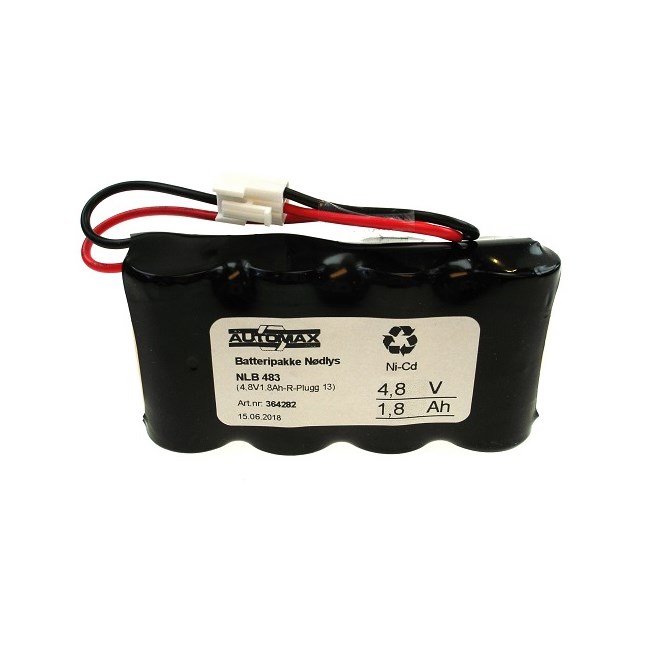 Volt: 4,8 Ah: 1,8 Lengde: 96 mm Bredde: 23 mm Høyde: 43 Vekt: 0,196 kg Terminal: Plugg 13 Kjemi: Ni-Cd Levetid: 3-5 Info: Nødlys batteri 4,8 volt Ni-Cd. Elotec