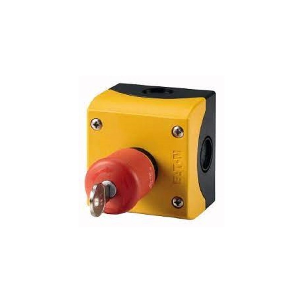 Kapslet bryter, Produkt rekkevidde: RMQ-Titan, Komplett enhet, Design: sopp-formet, Diameter: 38 mm, uten lys, Nøkkelbryter, Tilkoblingstype: skrutilkobling, Beskrivelse: Betjenings-sikker i henhold til to ISO 13850/EN 418, Antall hull: 1 Stk., Farge sopphode: rød, Farge kapsling: gul, Beskyttelsesgrad: IP66, IP67, IP69K, Kan kobles til SmartWire-DT: no, Kontakter N/C = Normalt lukket: 1 NC, Kontakter N/O = Normalt åpne: 1 N/O, Notater = sikkerhetsfunksjon, i henhold til IEC/EN 60947-5-1, Betjening i henhold til DIN EN 60947-5-1, K.5.4.1: mm 4.8, Maksimal avstand: mm 5.7, Minimum kraft for åpning: N 20, Positiv åpning (ZW): ja, Front dimensjoner: 35, Information angående utstyr levert: 1 nøkkel inkludert som standard, Standarder: IEC/EN 60947, VDE 0660, Montasje posisjon: Som påkrevd