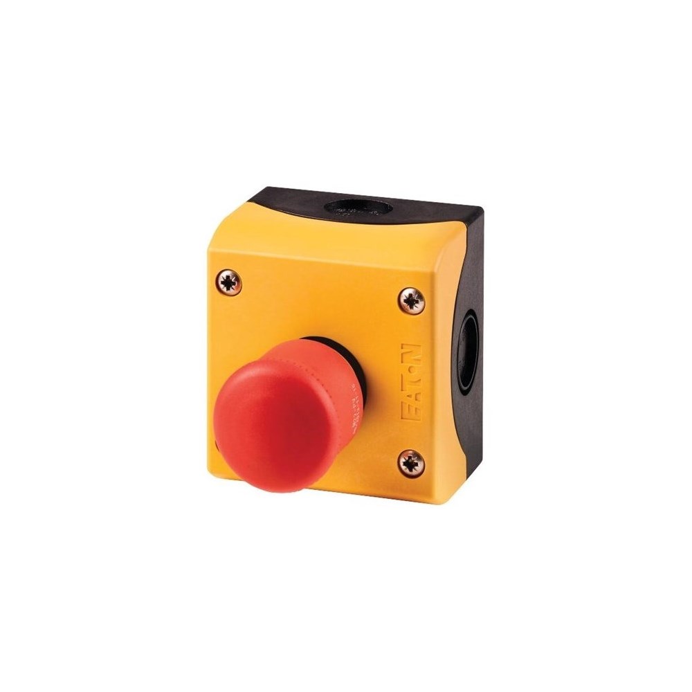 Kapslet bryter, Produkt rekkevidde: RMQ-Titan, Komplett enhet, Design: sopp-formet, Diameter: 38 mm, uten lys, Dra for reset Funksjon, Tilkoblingstype: skrutilkobling, Beskrivelse: Betjenings-sikker i henhold til to ISO 13850/EN 418, Farge sopphode: rød, Farge kapsling: gul, Beskyttelsesgrad: IP66, IP69K, Kan kobles til SmartWire-DT: no, Kontakter N/C = Normalt lukket: 1 NC, Kontakter N/O = Normalt åpne: 1 N/O, Notater = sikkerhetsfunksjon, i henhold til IEC/EN 60947-5-1, Betjening i henhold til DIN EN 60947-5-1, K.5.4.1: mm 4.8, Maksimal avstand: mm 5.7, Minimum kraft for åpning: N 20, Front dimensjoner: 35, Standarder: IEC/EN 60947, VDE 0660, Montasje posisjon: Som påkrevd