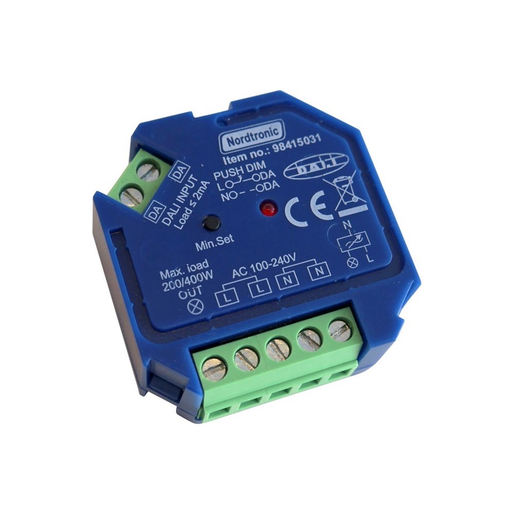 Box Dimmer DALI er en liten dimmer for innbygging for 230V belysning som skal styres via et DALI-signal, eller push-dimmes med et 8-230V styresignal. Produktet brukes til å styre vanlige fasedimbare armaturer med DALI-signal.
