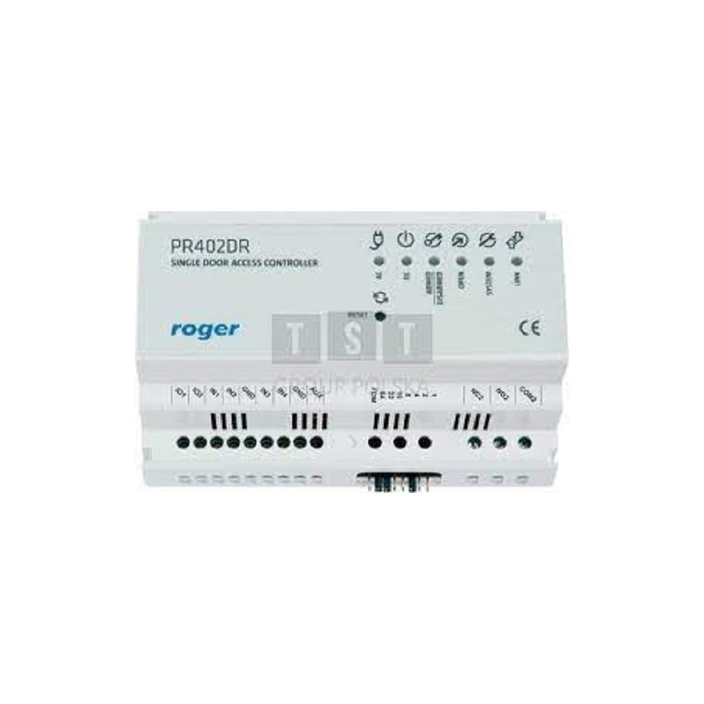 Dørkontroller for 1 dør - DIN skinne PR402DR adgangskotroller enheter kan fungere som standalone enheter eller som integrerte enheter i et adgangskontrollsystem med CPR32 nettverkskontroller. I standalone modus vil enheten overvåke en dør med inn /ut leser og trenger ikke kommunisere med noe annet utstyr. Alle hendelser vil lagres i det interne minnet og tidsstyrte hendelser styres av innebygget klokke. Systemer som benytter disse enhetene kan programmeres lokalt via COM/USB seriellport el