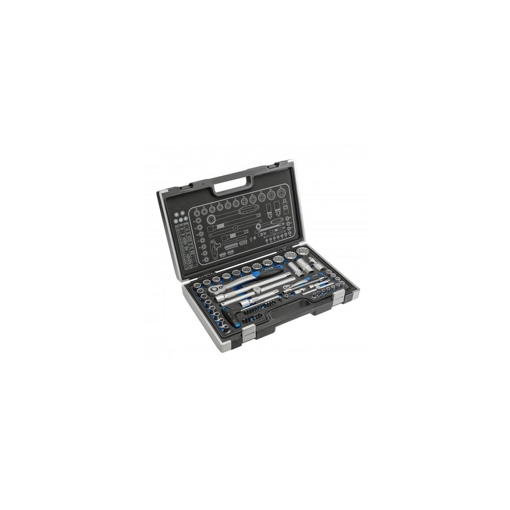 Piper 1/4 ”: 5, 5,5, 6, 7, 8, 9, 10, 11, 12, 13 mm Bits 1/4 ”: SL4.5, SL6.5, SL8 mm, PH1, PH2, PH3, T10, T20, T25, T27, T30, T40, H3, H4, H5, H6 mm Pipe adapter 1/4 ”, 1/4” bits adapter 1/4" T-stang, 1/4" skralle Forlengelse 1/4 ”, 75 mm Fleksibel forlengelse 1/4”, 150 mm Universalledd 1/4 ”, T-type håndtak 1/4”, 110 mm Piper 1/2”: 8, 9, 10, 11, 12, 13, 14, 15, 16, 17,18, 19, 21, 22, 24, 27, 30, 32 mm Piper for tennplugger 1/2”: 16, 21 mm, Universalledd 1/2” T-håndtak 1/2 ”, 250 mm, forlengelse