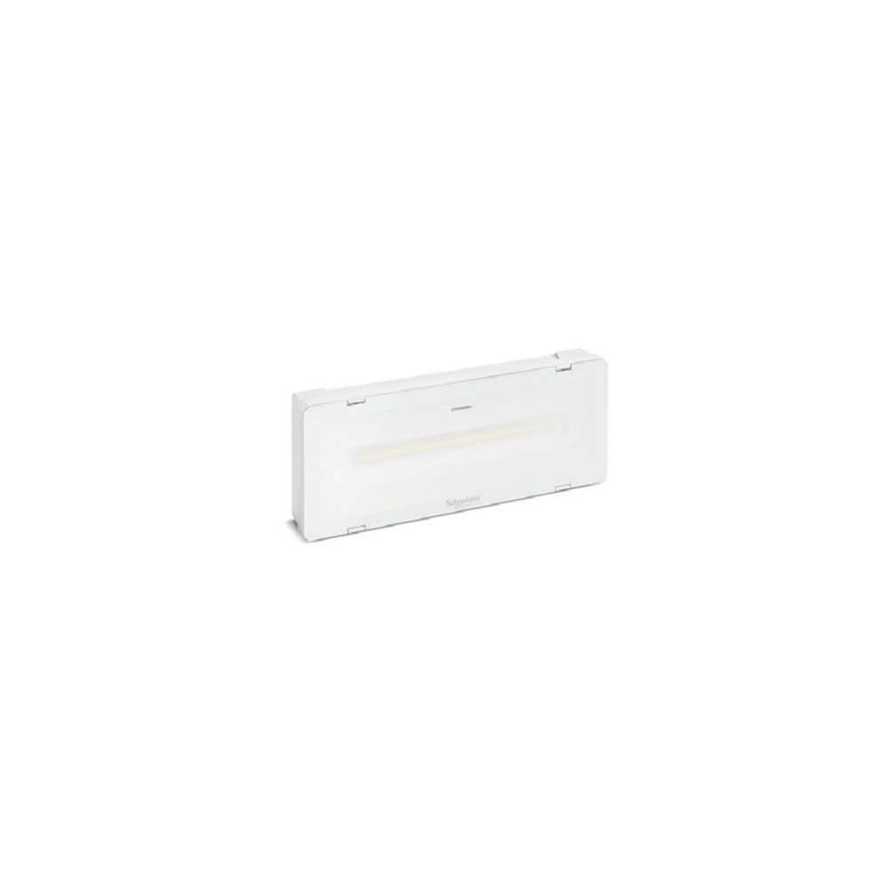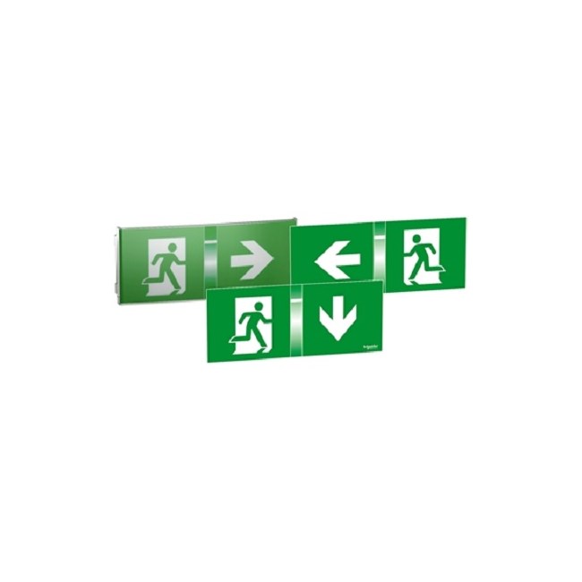 Dette Schneider Electric-produktet med piktoskjerm og 3 piktogrammer er et tilbehør for Exiway Smartled. Piktogrammer inkluderer piler til venstre, høyre og ned. Sikteavstand er 24 meter. Dimensjonene er (B) 127mm x (H) 304mm x (D) 30,5mm.