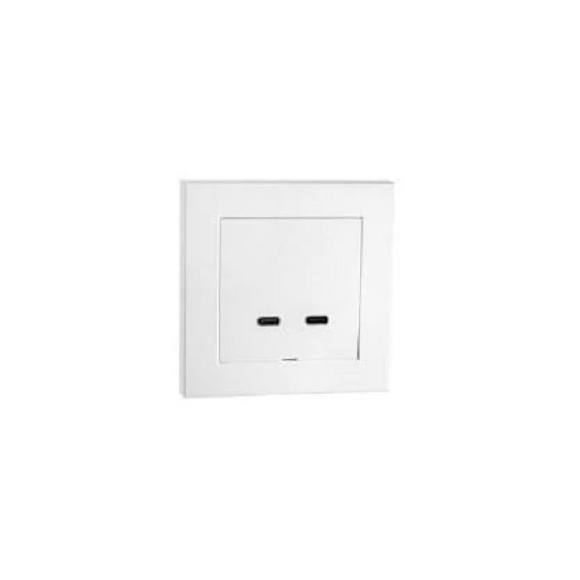 USB lader med 2 uttak (2xUSB C). Passer i standard veggboks eller påveggskappe og kan benyttes i rammer sammen med annet innfelt materiell. Laget i halogenfritt polykarbonat som gir økt fargebestandig hvitfarge.