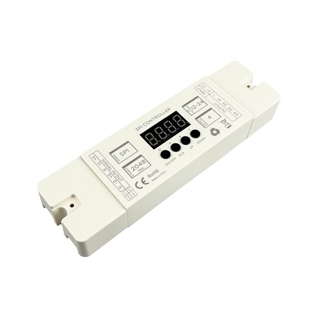 RF-mottaker 2,4GHZ for SPI led strips • Arbeidsspenning 12/24V DC <1W • Styrer SPI strip 3 ledninger Dim/CCT/RGB/RGBW • Styrer opptil 4 striper maks 2048 punkter • Funksjoner: Dimmer/CCT/RGB/RGBW/SPI • Scene/modus 29 Dim, 54 CCT, 136 RGB. RGBW • Driftsmodus: master eller slave • Innebygd display for 4-tryksknappkontroll • Frittstående drift mulig • Kompatibel med radiokontroller A40RCRGB00N, A40RCDIMCT og berøringskontroll A40WALLWP86K • Signal 2,4GHz rekkevidde opptil 20m • Oppgi minne