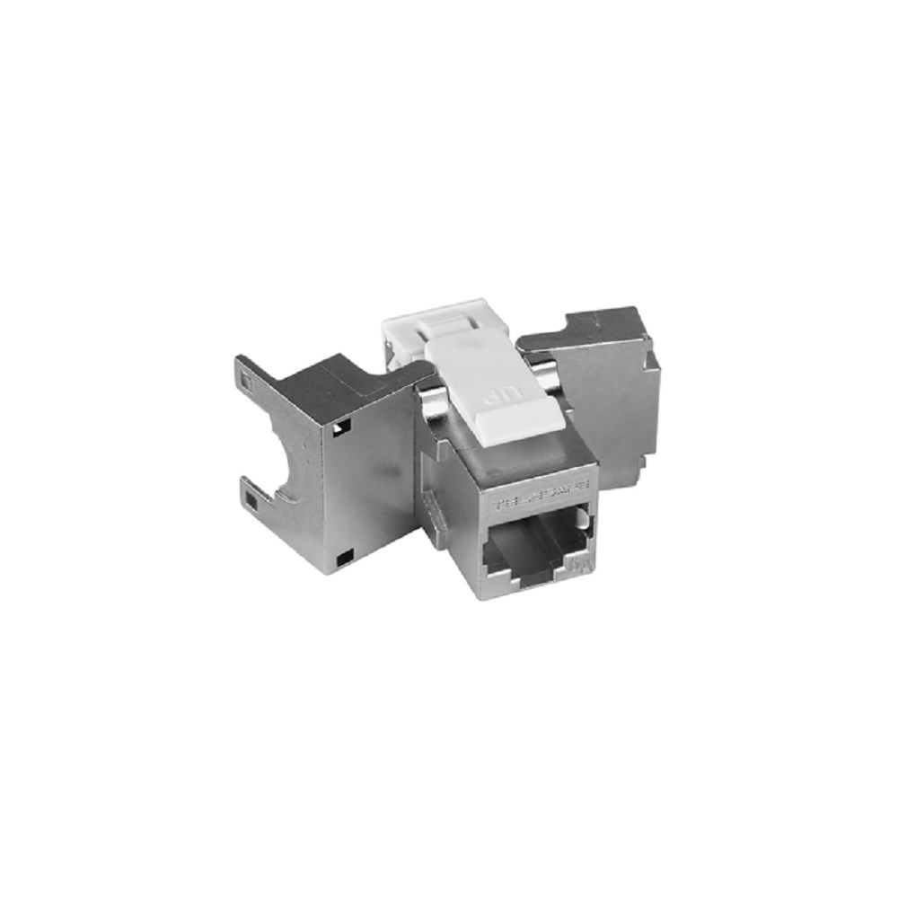 Compact One RJ45 Keystone Kat.6A STP er en verktøyfri kontakt med høy ytelse og rask terminering. Støtter 10 Gigabit Ethernet i hht. EN50173 Telesafe Compact One rask terminering på 1-2-3.
