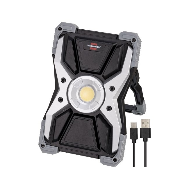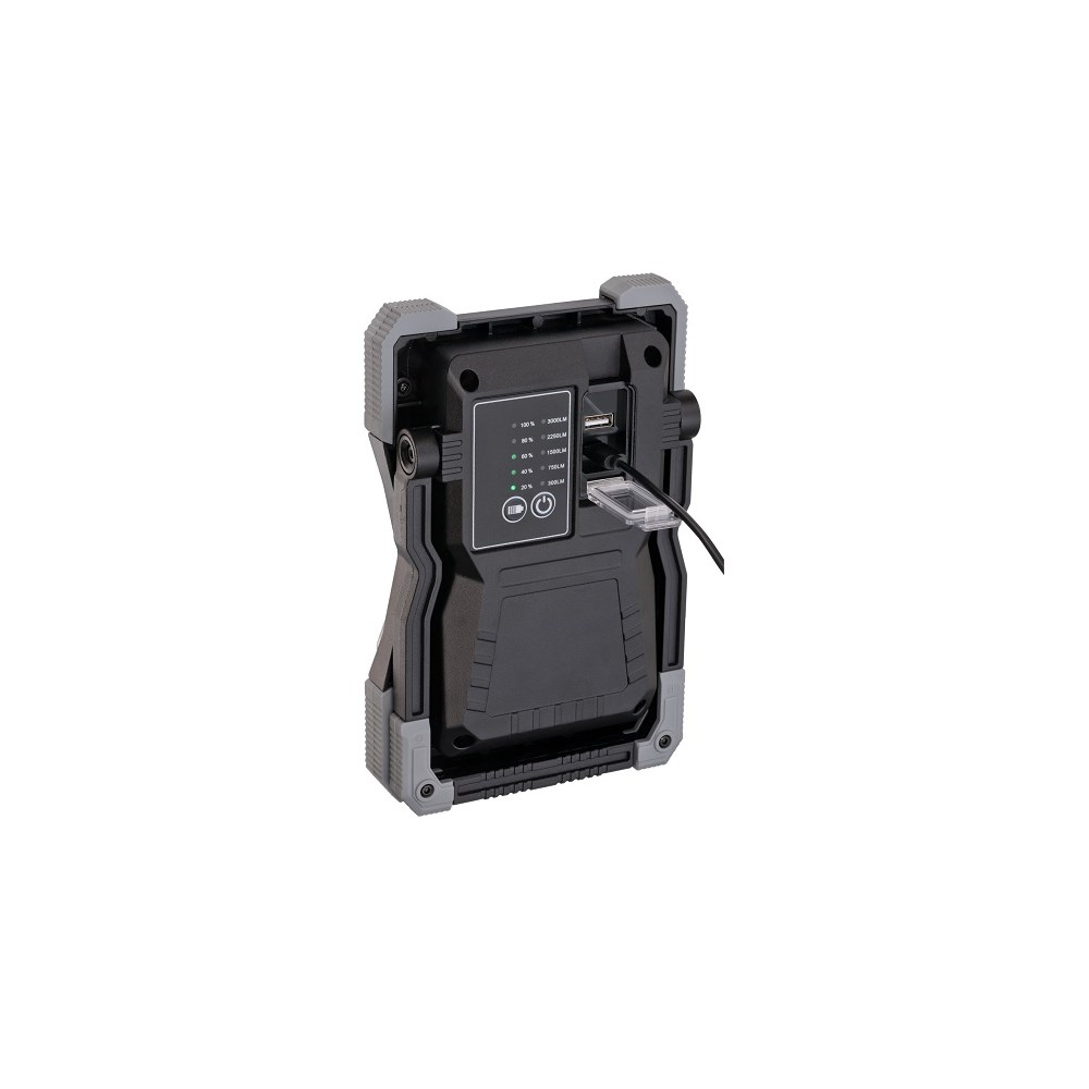 LED-flomlys med 5 lysmoduser 10% - 25% - 50% - 75% - 100% og Powerbank-funksjon (USB-ladetilkobling 1 A) for enheter med USB-ladekabel som smarttelefoner, nettbrett, etc.LED-lyskasteren er støtsikker og fallsikker (fra opptil 3 meter høy) - med kantbeskyttelse laget av høykvalitets plast og et støpt aluminiums hus - ideell for byggeplasser, verksteder, ...Verkstedlys med ladeindikator, powerbank-funksjon for komfortabel lading av f.eks smarttelefoner (ladetilkobling type C), og stabilt flertrinns sammenleggbar rammeOppladbart LED-arbeidslys (Li-Ion-batteri 7,4V/5Ah) med en lystid på: 3t (100%), 4t (75%), 6t (50%), 12t (25%), 25t (10%) - inkludert 1x ladekabel, 1x bæreveske